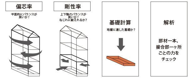 構構造計算(許容応力度計算)により基礎、梁、マグサなどの部材が破壊しないための安全な強度(基礎の構造、偏心率、剛性率、層間変形、地震荷重、風荷重、鉛直荷重、応力度)の検証を行い安全性を確かめます。 ※性能評価書は別途費用が発生します。