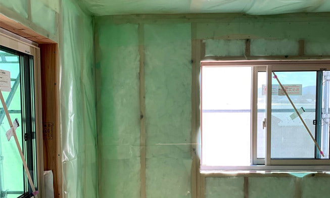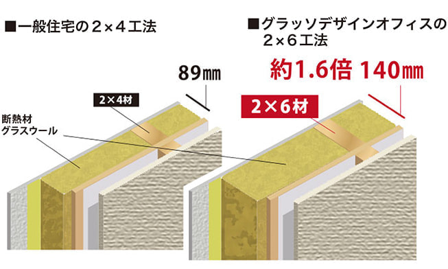 2×6工法にすることで、2×4工法より壁内の寸法は約1.6倍となります。より厚い断熱材を入れることができるので、断熱性能を格段に向上させる事ができます。断熱性能の他にも耐震性能や遮音性能も大きく向上させることができ、より快適に安心して暮らせる家になります。