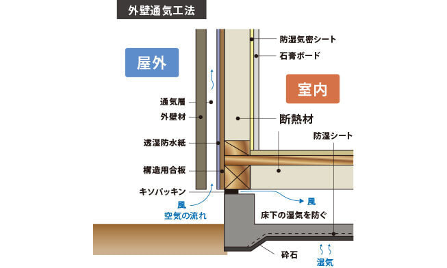 建物の直下全面を板状の鉄筋コンクリートで支える「ベタ基礎」を標準で採用しています。建物を点で支える布基礎に比べ、ベタ基礎は家の重みを底板全体で支えるので負荷が分散し、安定性に優れます。床下の換気には基礎パッキンを使用。防湿・防水シートを敷き込むのでシロアリや湿気対策も万全です。